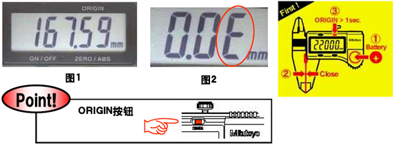 三豐卡尺更換電池后,顯示器可能會出現任意數值(如圖1),如不進行原點設置而直接使用的話,會出現圖2中末位“E”的報錯現象。